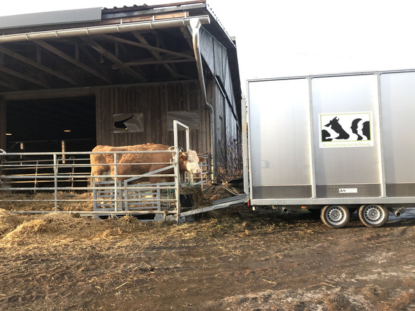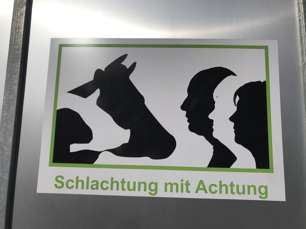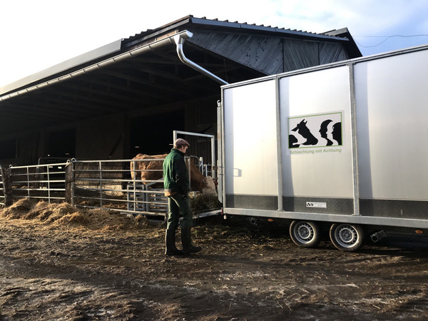 Seither läuft eine Schlachtung bei uns anders ab. Die Anstrengung des Transportes für das Tier entfällt, da die Tötung direkt am Stall oder Weiderand stattfindet. Das entsprechende Tier wird vorher für einige Zeit in einem extra Stall oder Weidebereich separiert. Der Schlachtanhänger dient in dieser Zeit als Kulisse, direkt dahinter befindet sich das Fressgitter und eine Rampe. Auf diese Weise kann die Kuh den Anhänger kennenlernen. Am Tag des Schlachtens wird kurz vorher die Rückseite des Anhängers geöffnet. Der Landwirt, der die Schlachtung durchführt – er hat extra ein Zertifikat dafür erlangt – betäubt die Kuh mit einem Bolzenschussgerät. Unmittelbar danach wird das Tier über einen Schlitten in den Hänger gezogen, dieser wird geschlossen und der Landwirt nimmt zur eigentlichen Tötung den Bruststich vor.