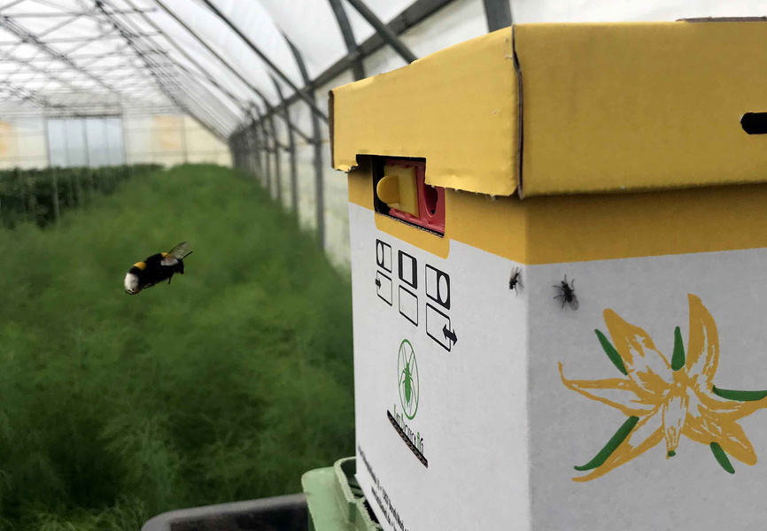 Ja, richtig gelesen! Zu Hilfe kommen uns fleißige Hummeln. Die zu den echten Bienen gehörenden Erdhummeln sorgen zuverlässig für die Bestäubung der Tomatenblüten. Sonst würde das der Wind übernehmen, jedoch ist der in den Gewächshäusern nicht ganz so zuverlässig vorhanden :-) So fliegen also die kleinen gelb-schwarz-gestreiften Wesen zur Nahrungssuche von Blüte zu Blüte und geben damit gewissermaßen den Startschuss für die zukünftigen Früchte.