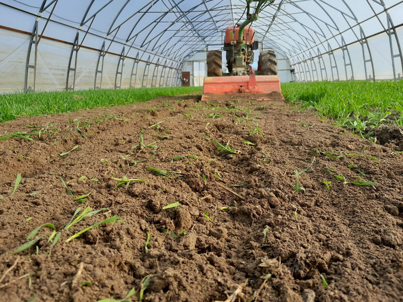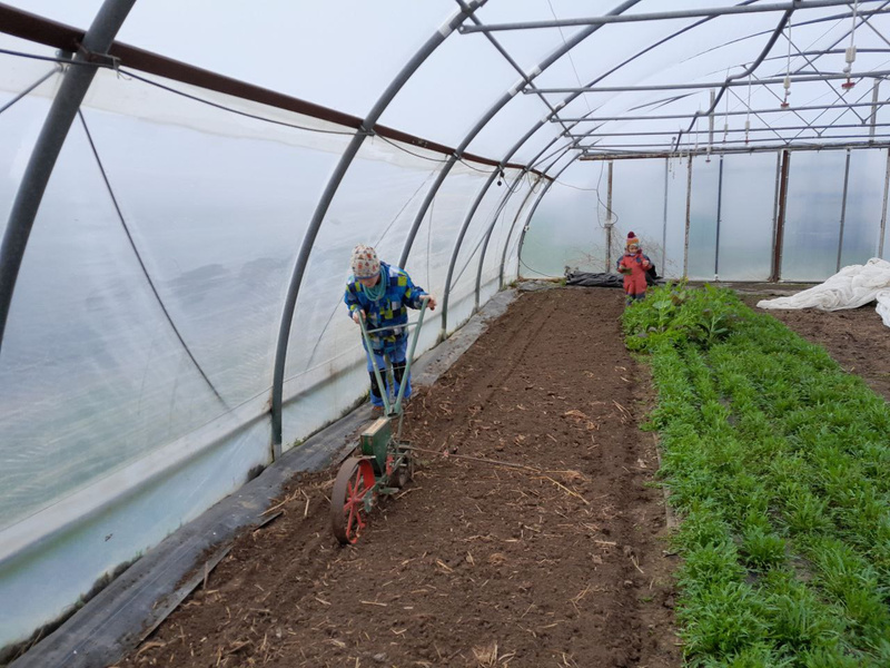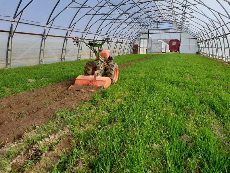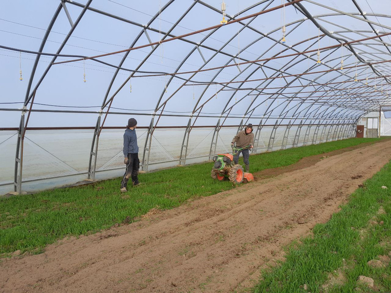 Aber der Reihe nach: Während der Winterzeit werden in den Häusern Zwischenfrüchte eingesät. Hier sind das Roggen und Erbse. Diese Kulturen sorgen für die Bedeckung des Bodens, seine Durchwurzelung und tragen gleichzeitig Nährstoffe ein. So bleibt der Boden vital und gesund. Vor der Pflanzung bzw. Aussaat des Gemüses werden die jungen Pflänzchen der Zwischenfrucht eingearbeitet. Dabei sind Roggen und Erbse in einem sehr jungen Statium. Auf den Fotos sieht man Marianna und John, unsere Auszubildenden.