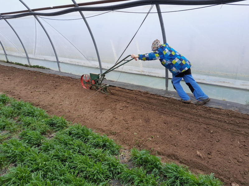 Sobald der Boden vorbereitet ist, können auch Aussaaten stattfinden. Das sind bei uns zum Beispiel Radieschen. Da wir ein paar mehr Radieschen benötigen erledigen wir das mit Hilfe einer Sähmaschine. Hier darf sich Ole ausprobieren. Er ist der Sohn unseres Gärtners Christian und hat echt Freude dabei! Er braucht dafür echtes Fingerspitzengefühl, damit die Reihen auch schön gerade werden ;-)